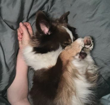 Kayce is a complete love bug, he is on the low end of the spectrum energy level wise. He enjoys to lay around the house (HE LOVES TO SLEEP) and keep me company during the day, extremely loyal. Reserved around strangers for the first 2 minutes then warms up quickly. Low natural herding instinct, he has zero interest in our cows. Gets along great with other dogs and great with children. Many people have had that special heart dog in their life that they connect with so deeply, Kayce is that dog for us <3